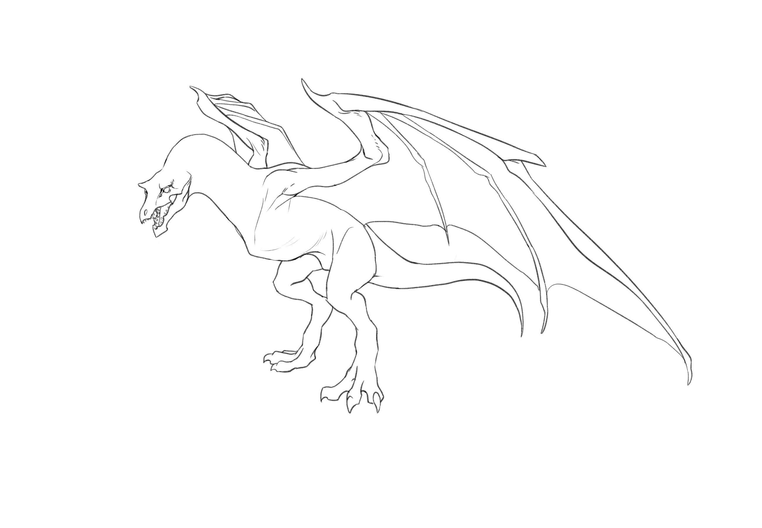To draw a dragon properly you need to start with a few simple lines based on its skeleton. To begin using your HB pencil map out the basic anatomy of your dragon.